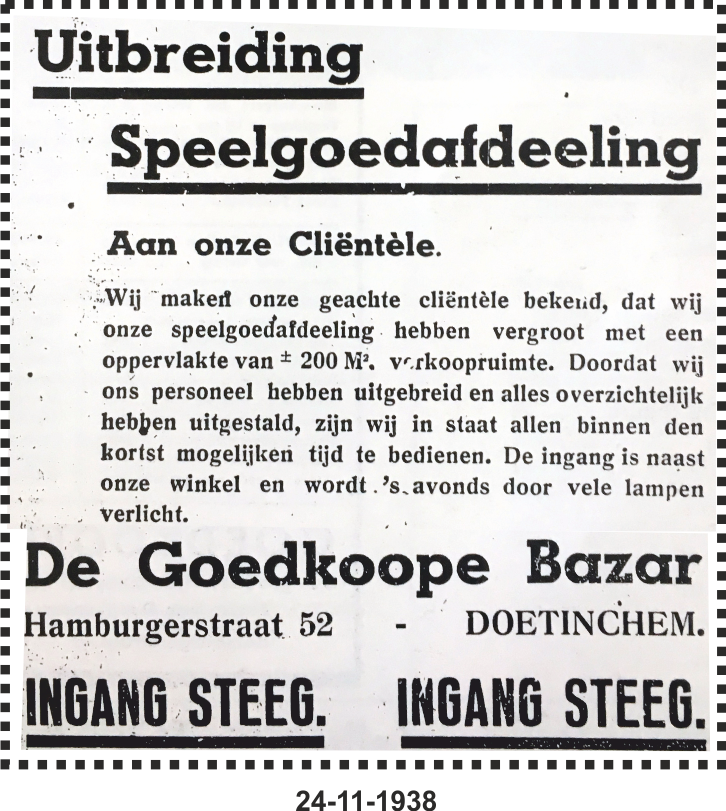 Die uitbreiding kwam snel, want op 24 november 1938 nog net voor de grote Sint Nicolaasverkoop opende hij een grote speelgoedafdeling van 200 m².
